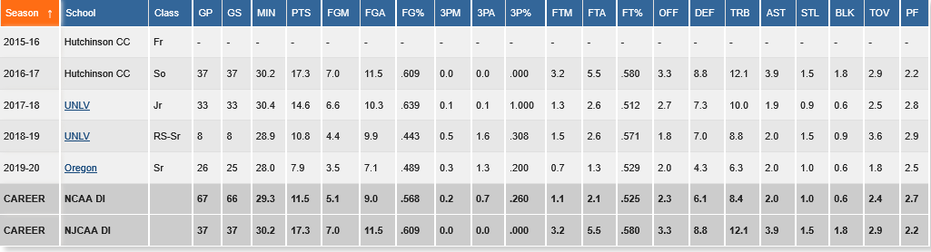 Τη σεζόν 2019-20 έπαιξε στο Oregon, με 7.9 πόντους και 6.3 ριμπάουντ. Το 2020-21 αγωνίστηκε στη θυγατρική λίγκα του ΝΒΑ με τη φανέλα των Memphis Hustle.